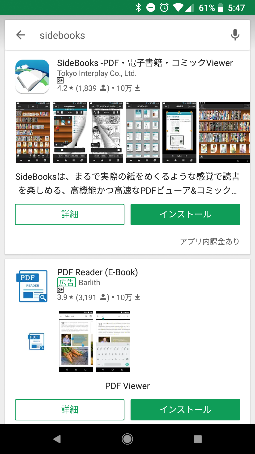 Google Play より、無料の電子書籍ビューワー「SideBooks」を検索しインストールします。
