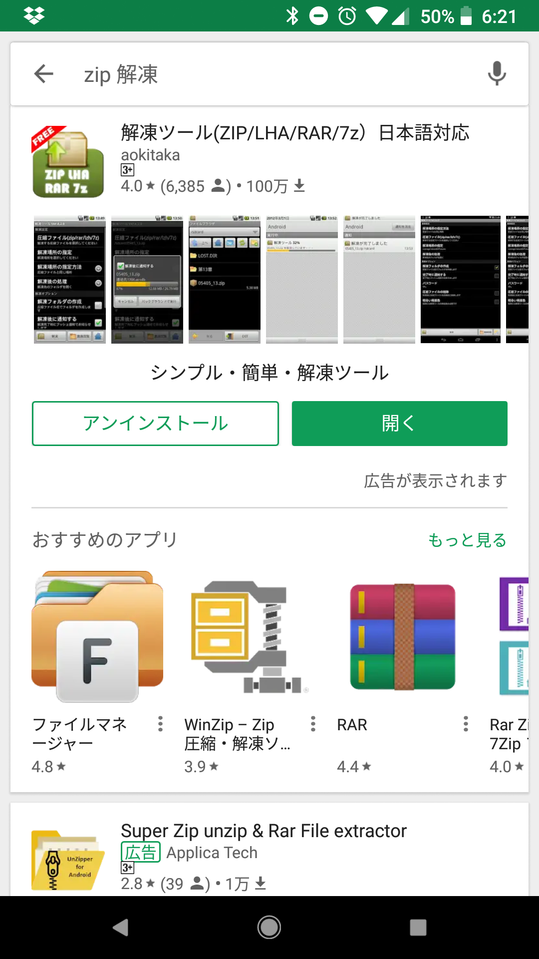 再度 Google Play を開き、ZIPファイルの解凍ソフト「解凍ツール(日本語対応)」を検索し、入手します。