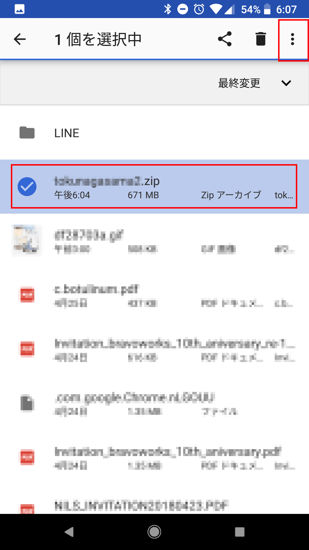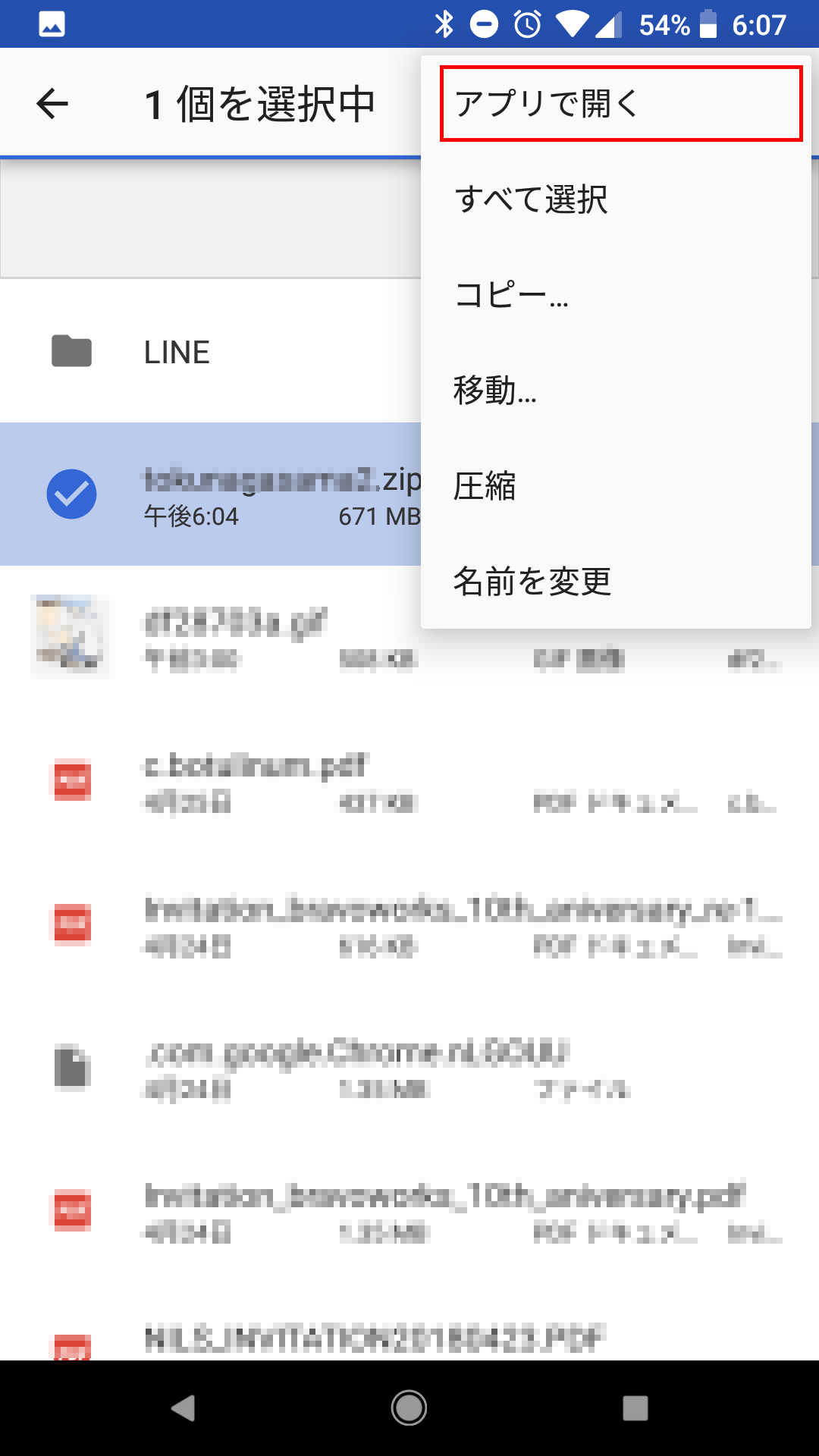 ダウンロード済みのZIPファイルを選択して、右上のメニューから「アプリで開く」で解凍ツールで開きます。