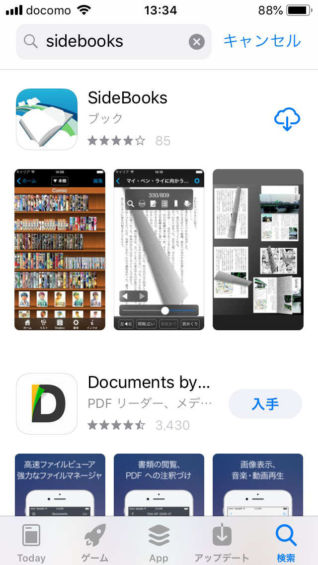 App Store より、無料の電子書籍ビューワー「SideBooks」を検索しインストールします。
