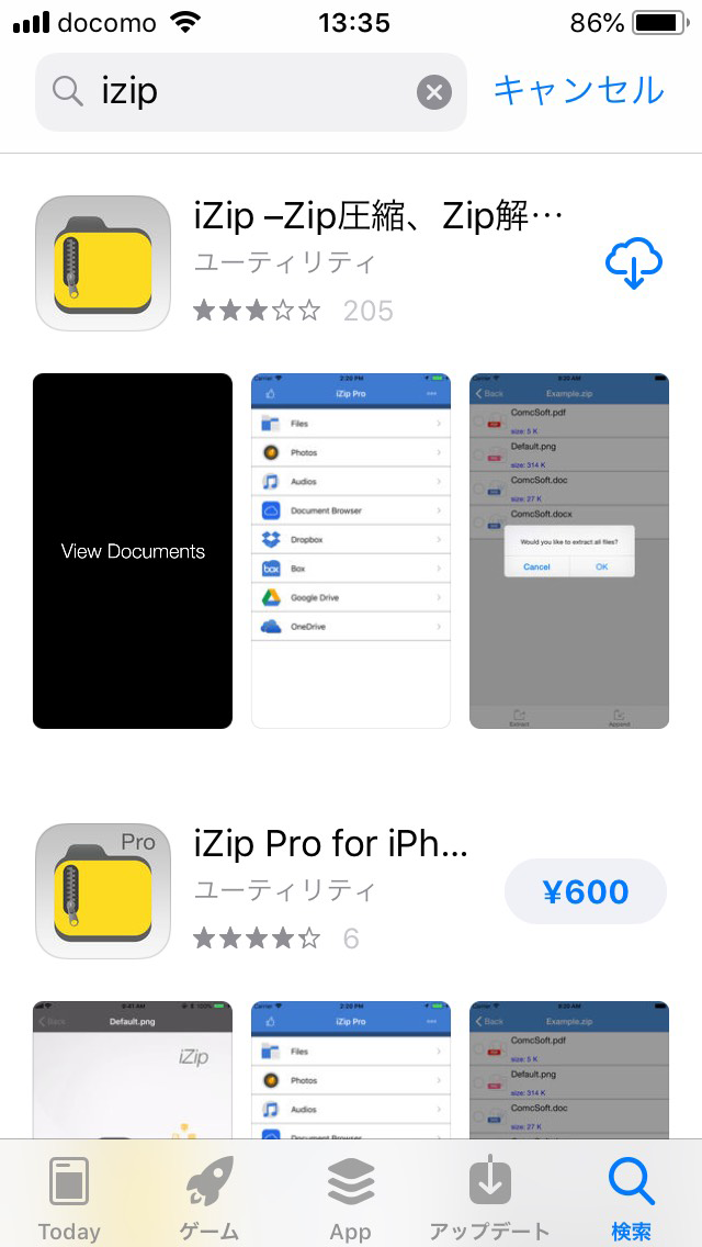 再度 App Storeを開き、ZIPファイルの解凍ソフト「iZIP」を検索し、入手します。