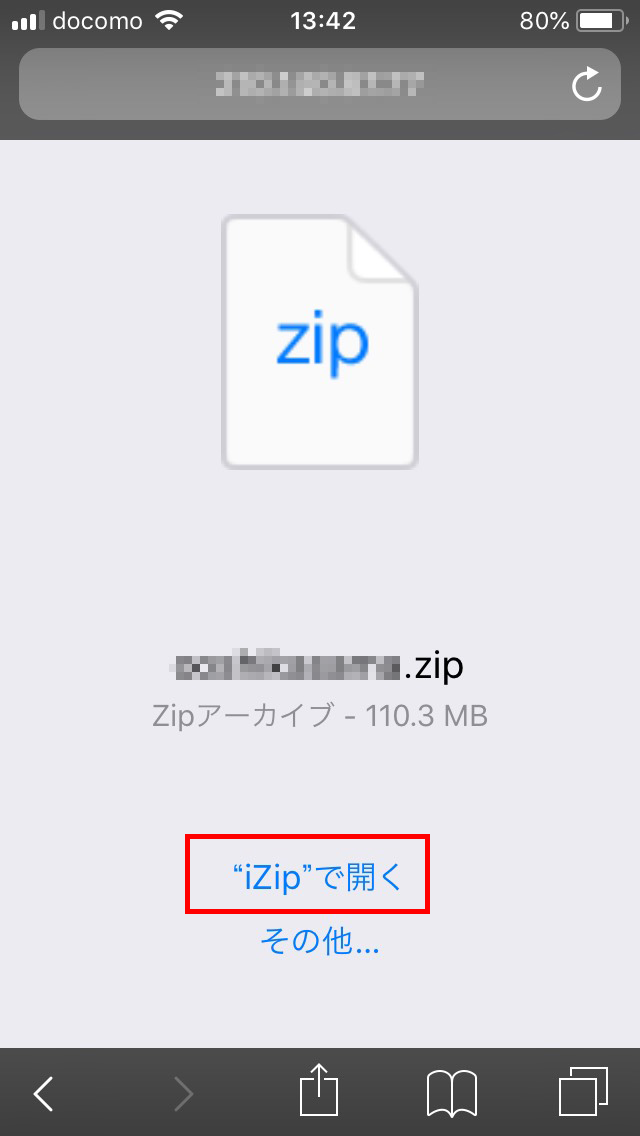 ダウンロードが完了すると、画面が変わり、「iZipで開く」というリンクが表示されますので、そこをタップします。