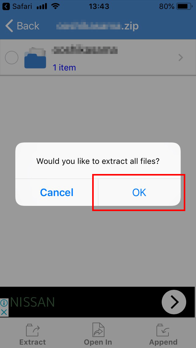 ZIPファイルをiZipで開くと、ダウンロードしたファイルが表示されますので、タップしてOKを押します。