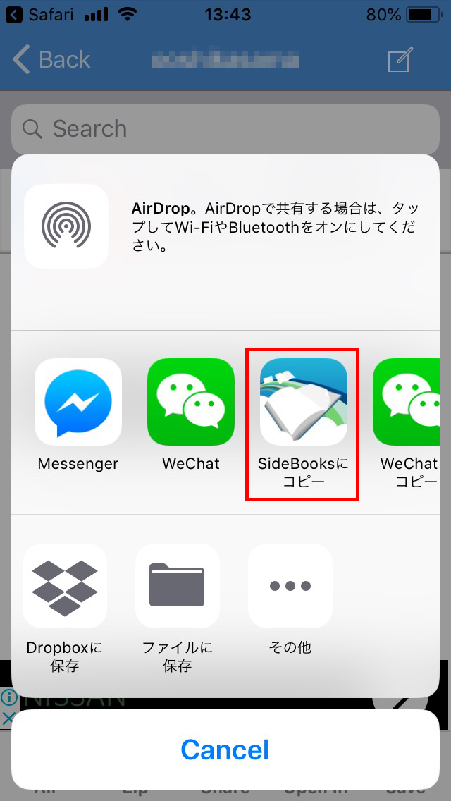 事前準備でインストールしたSideBooks アプリで開くため「SideBooksにコピー」をタップします。